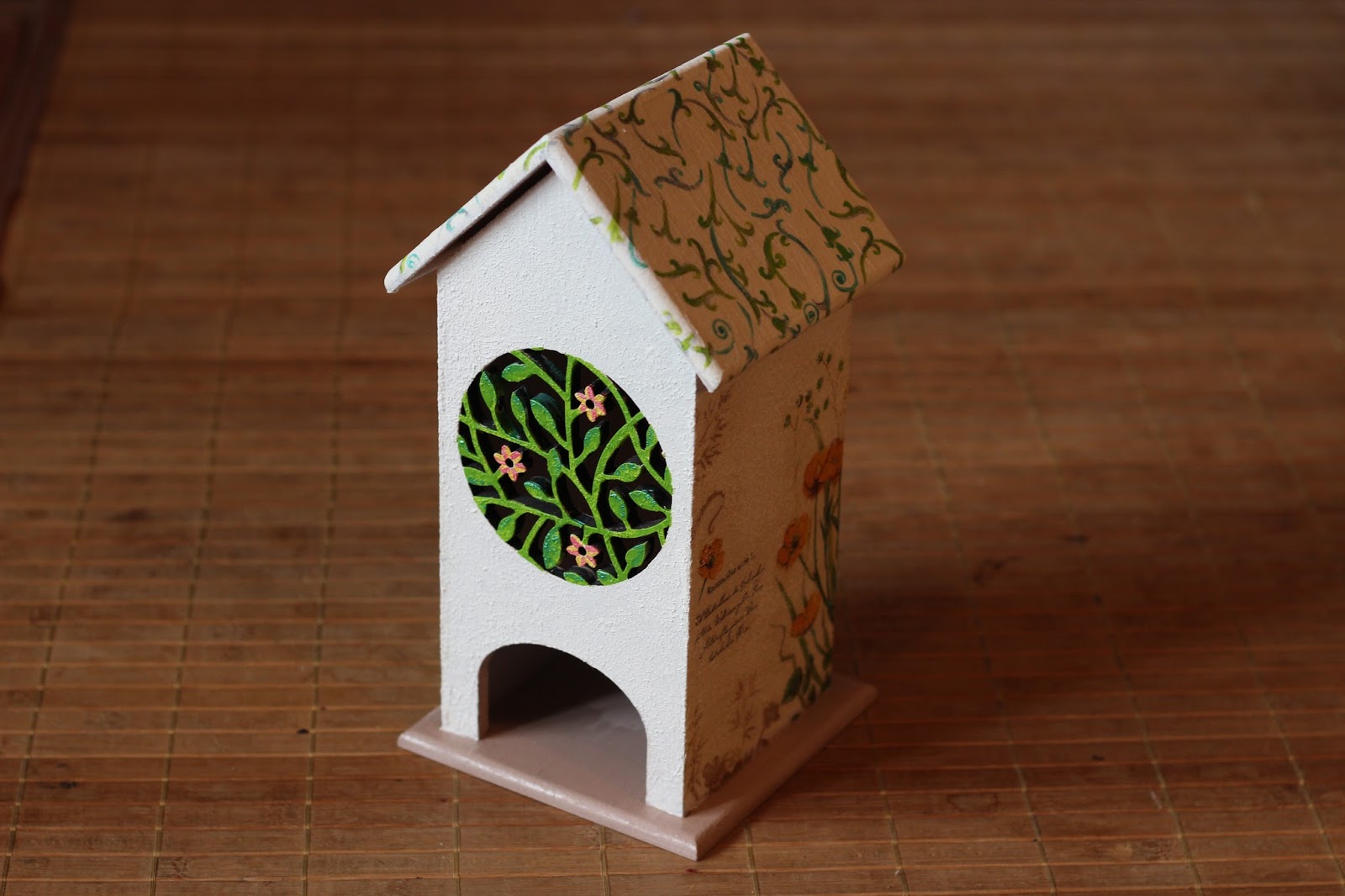 Кое что дорисовала сама. Мне нравится, что порой не поймешь, где декупаж, а где моя кисть...))))) "Фасад" домика оформлен фактурной пастой (той же техникой, что и предыдущий.